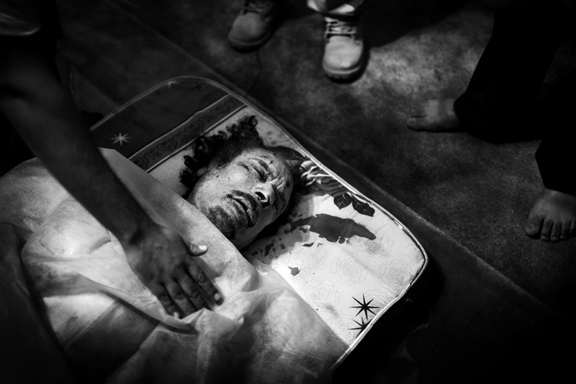 «Gheddafi, l’uomo che fino a otto mesi prima giocava con il mondo, era lì, davanti a me, come un corpo qualsiasi sbattuto su un materasso» «Nell’ottobre 2011 ero di base a Misurata e tutti i giorni facevo 250 chilometri per raggiungere Sirte e documentare l’evoluzione della guerra. Un giorno un gruppo di ribelli ha cominciato a dire che Gheddafi era morto, ma non avevo la certezza che fosse vero: già in altre occasioni era capitato che ne sostenessero la cattura e la morte per propaganda e incitamento alla rivolta. Dopo la conferma del mio giornale, il The Times, sono partito per Misurata e mi sono messo alla ricerca del corpo nelle moschee e negli ospedali. Un amico mi ha avvisato che in una casa della periferia avrei potuto fotografare il cadavere di Mutassim, il figlio ucciso quello stesso giorno. Più tardi un giornalista locale – probabilmente un guerrigliero – mi ha chiesto se volessi vedere il corpo di Gheddafi. Mi ha accompagnato in un luogo isolato dall’altra parte della città, dove due ribelli mi hanno mostrato un’immagine di Gheddafi morto scattata con il cellulare. A bordo della loro auto sono arrivato in una casa di campagna, proprietà di un faccendiere che li aveva aiutati nel rifornimento di cibo e munizioni. Lì ho cominciato a fotografare quello che avevo davanti: l’uomo che fino a otto mesi prima giocava con il mondo era lì ai miei piedi come un corpo qualsiasi sbattuto su un materasso. Mi sono reso conto che di fronte alla morte siamo tutti uguali. Gheddafi ha governato la Libia per quarantadue anni, ma è caduto facendo la stessa fine di tanti altri prima di lui».