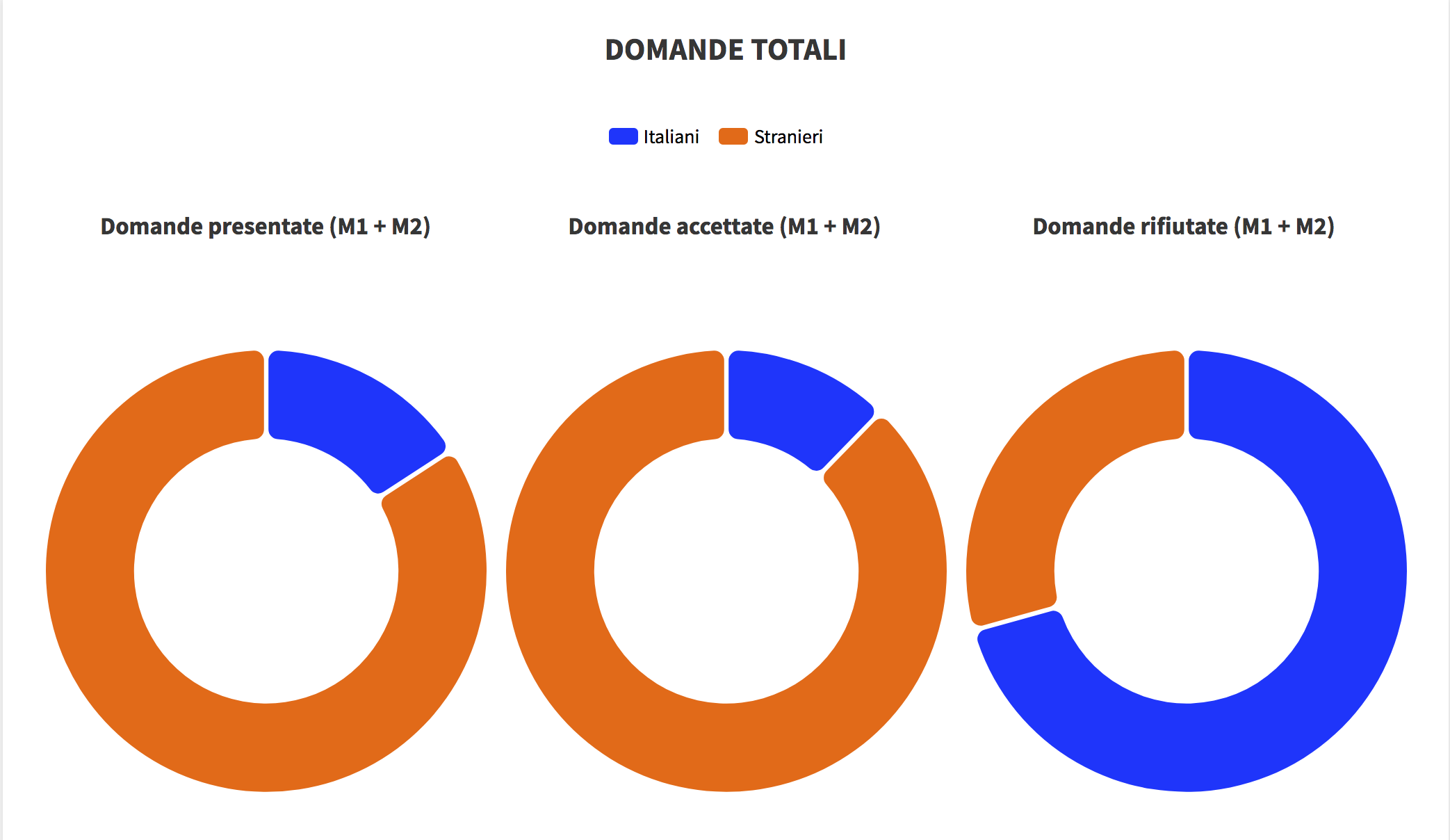 Complessivamente, come si può osservare nel grafico n°3 pubblicato in apertura, a fronte di 897 ammessi totali, 787 sono cittadini stranieri (87%) e 110 sono italiani (13%).