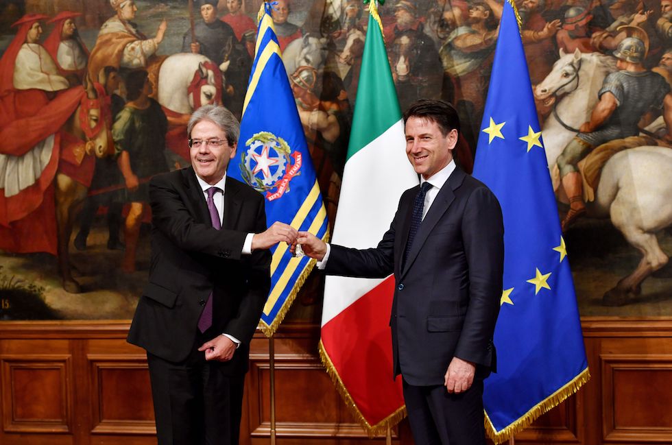 Il rito della campanella tra Paolo Gentiloni e Giuseppe Conte – Roma, 1 giugno 2018 (ANDREAS SOLARO/AFP/Getty Images)