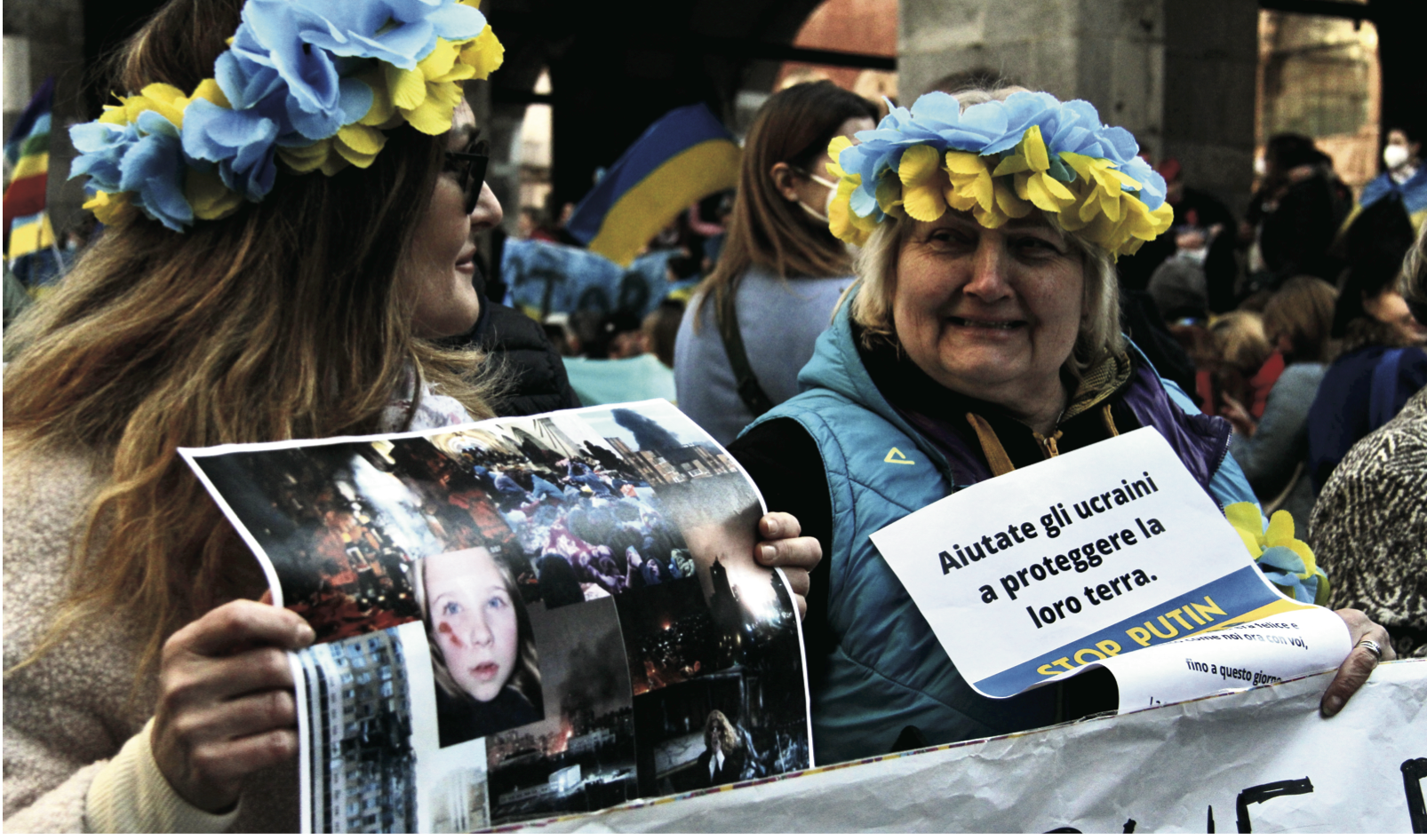 C’è una signora che tiene in mano il telefono e continua a guardarsi attorno. Dall’altro lato dello schermo appare un viso giovane rigato dalle lacrime. È un’immagine che grida “resistenza”, perché in mezzo a queste piazze variopinte ci sono le storie di famiglie divise dalla guerra, di persone costrette a lasciare le proprie case in una corsa contro il tempo per la vita.Si ascoltano i racconti di chi assiste impotente alla distruzione del proprio Paese, pensando a come portare in salvo gli amici e i parenti rimasti lì. È il caso di Mia, 23 anni. Mia è nata a Čerkasy ma vive in Italia da più di dieci anni. Dal giorno dell’invasione russa in Ucraina, Mia è presente a tutte le manifestazioni. Suo padre è partito immediatamente per raggiungere in autobus il confine con l’Ungheria e trasferire in Italia la nonna e gli amici che abitavano a Kyiv, ma sua cugina Iryna si trova ancora là.