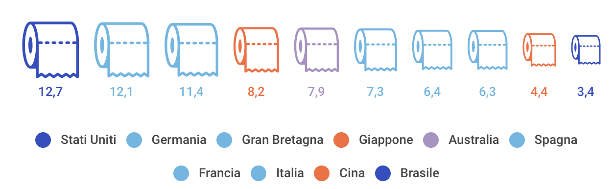 Ma quanta ce ne serve? E perché in mezzo mondo è introvabile?Sembra assurdo, ma è proprio così: il 25% della popolazione mondiale che la usa regolarmente consuma 57 strappi al giorno a testa, cioè 100 rotoli a testa l’anno. O 384 alberi abbattuti, a testa, per ciascuno di noi nel corso della sua vita. Un fabbisogno, che già in tempi normali, si legge in un reportage dell’emittente statunitense Abc, costringeva i tre maggiori produttori di carta igienica del mondo (Georgia Pacific, Kimberly Clark, Procter & Gamble) a lavorare a regime su turni di 24 ore: è l’unico modo per avere un margine di guadagno su un prodotto così poco costoso e insieme così laborioso da produrre.Ogni italiano ne consuma in media 70 rotoli ogni anno, l’equivalente di 6,3 kg (il peso della carta igienica consumata, per avere un’idea della carta utilizzata, si può vedere nel grafico in basso). Sembra tanto, ma non è nulla in confronto agli Stati Uniti, dove nel gabinetto ne finiscono ben 141 (12,7 chili). In Europa i Paesi più “spreconi” sono la Germania (134 rotoli) e la Gran Bretagna (127). Come si può vedere nel grafico, l’Italia è il Paese più risparmiatore d’Europa.