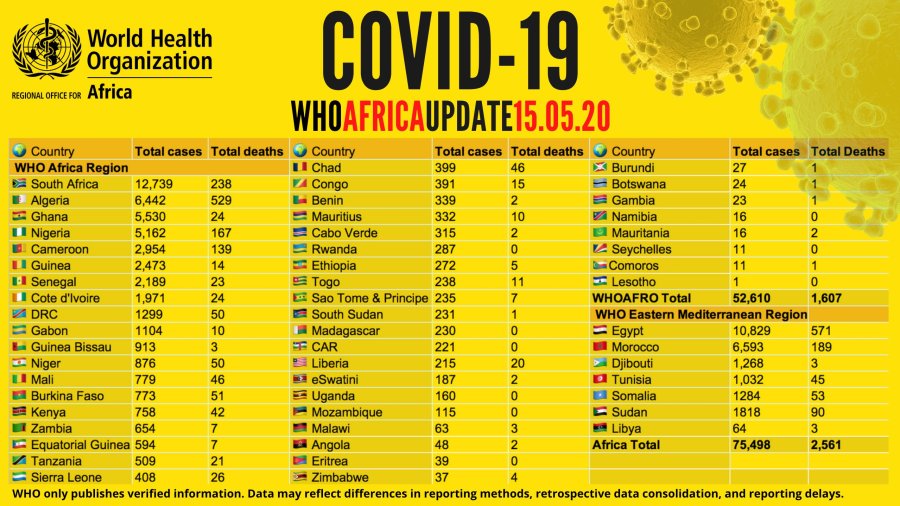 Come il resto del mondo, anche gli stati africani hanno cercato da subito di mettere in campo le loro risorse per contrastare gli effetti della pandemia. Ma il virus è stato molto più rapido: il 2 aprile 44 stati avevano registrato 5.360 contagi e circa 150 decessi con un aumento giornaliero del 10%. Il 15 maggio i contagi sono arrivati a 75.498 e i morti a 2.561.