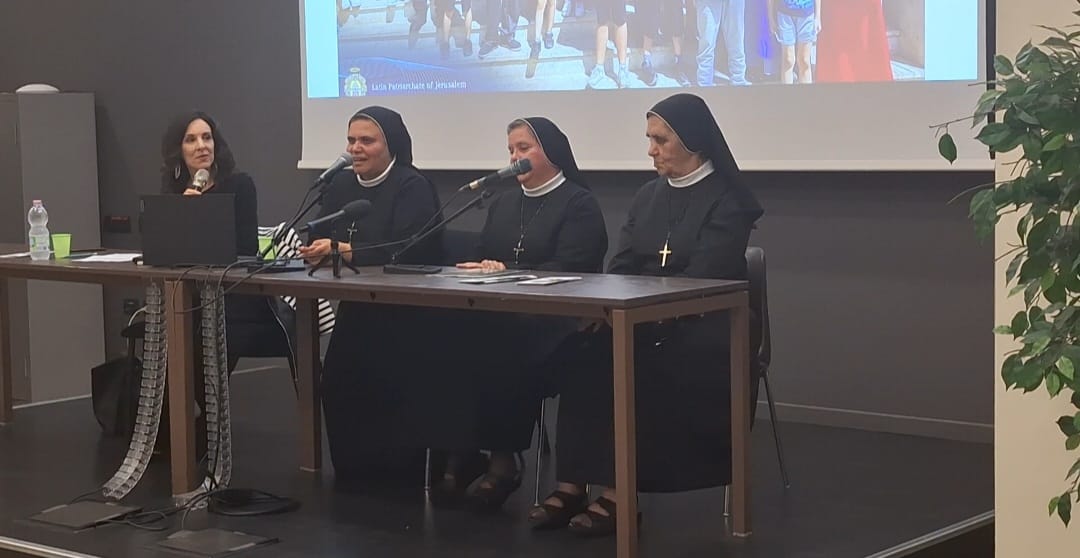 Da sinistra a destra: la giornalista Chiara Zappa, suor Nabila, suor Martina e suor Bertilla, tutte e tre della Congregazione del Rosario di Gerusalemme