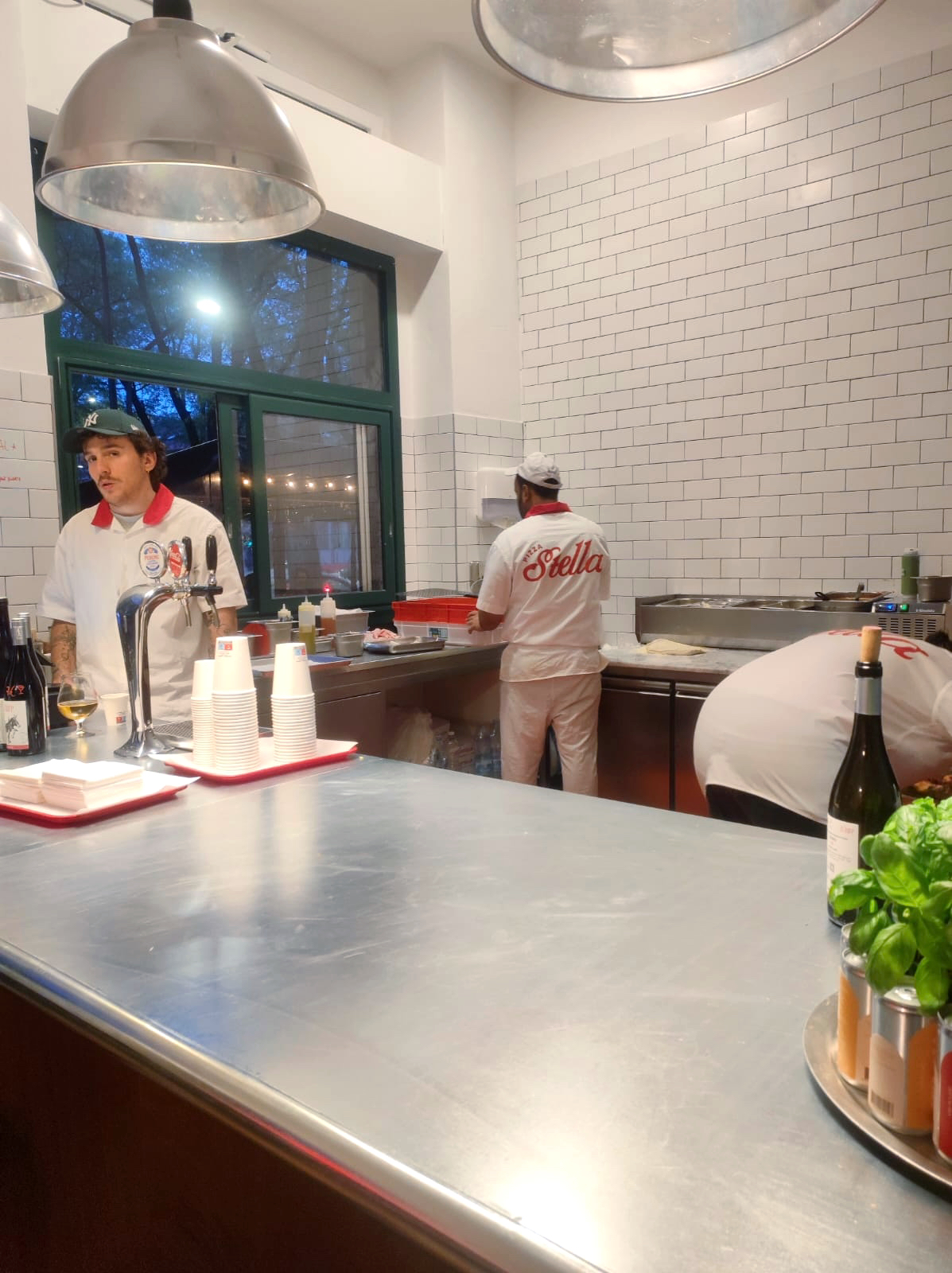 Una parola rossa su sfondo bianco occupa tutta l’insegna: “PIZZA”. Sotto, tre vetrine da cui è possibile vedere l’interno del locale per intero. In quella più a destra, appena sopra le bottiglie di vino naturale ordinatamente disposte una a fianco all’altra, brilla il nome della pizzeria: Stella.