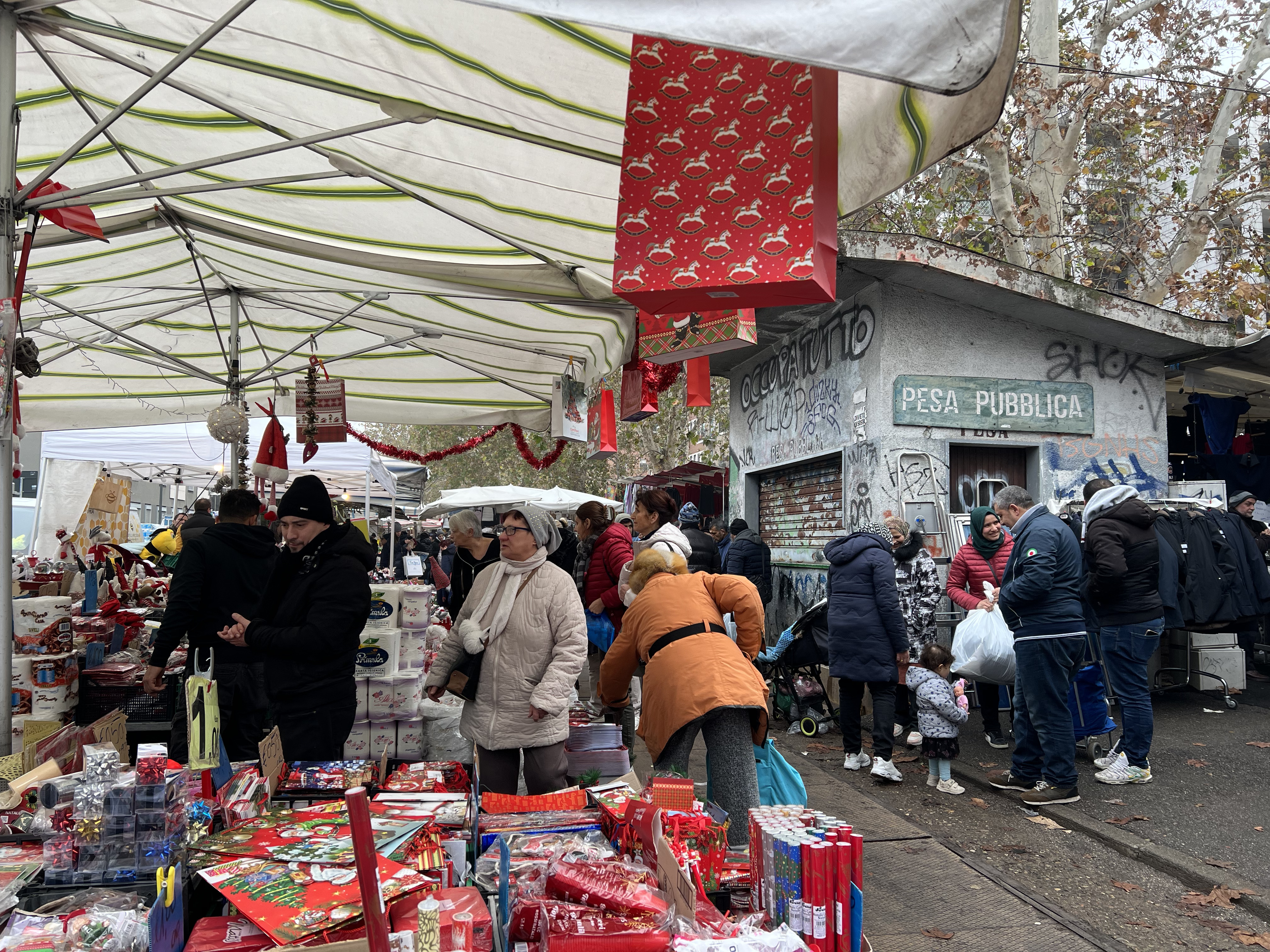 Basta attraversare l’affollato corridoio che separa le bancarelle per arrivare da Olga, venditrice russa di piante e fiori. Di lei, colpisce subito l’ostinato buon umore mentre racconta: «Le vendite sono calate del quaranta percento dal 2022. Si fanno pochi affari, ma almeno il martedì e il sabato, in viale Papiniano, c’è sempre qualcuno che spende in tronchi di pino, stelle e vischio dalle bacche rosse». Dello stesso avviso è Davide, il commerciante di giocattoli che gli affari dei bei tempi fatica a ricordarli: «Per fare contenti i bambini si fanno sacrifici, eppure non è come gli altri anni. I soldi che girano sono pochi e con tutte le disgrazie che stanno accadendo nel mondo…». Al carretto delle leccornie compaiono inaspettatamente tre Terziarie di San Francesco, abito bianco e tanta speranza negli occhi. Suor Jannette, Suor Karina e Suor Corinne qui sono di casa tutti i giovedì, dove vengono per acquistare caramelle e dolcetti da regalare ai ragazzini della parrocchia: «A Natale, ci piace distribuire generi alimentari e frutta. Ciò che avanza va alla mensa qui vicino, dove i numeri sono aumentati parecchio negli ultimi mesi».