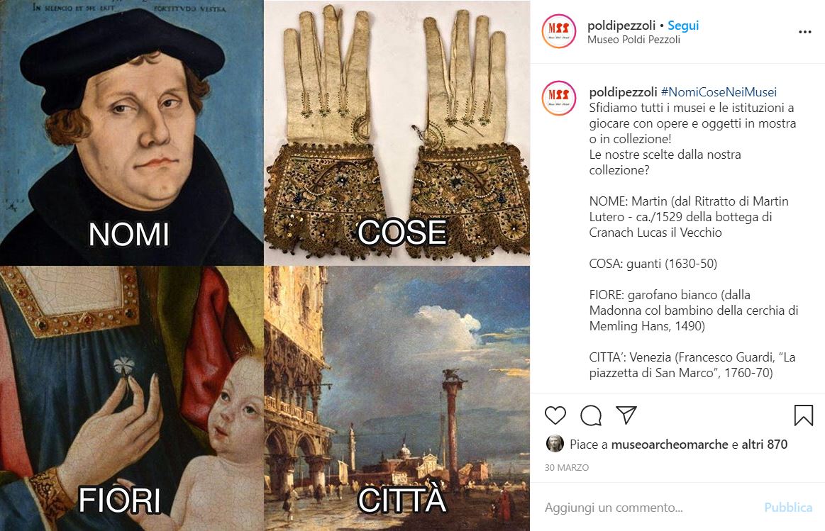 A proposito del dialogo con altre realtà museali, il periodo di quarantena ha permesso di rilanciare le attività sugli account social del Poldi Pezzoli, che su Instagram ha fatto tendenza lanciando la challenge NomiCose nei Musei. Dal 30 marzo in poi hanno aderito istituzioni italiane – come la Pinacoteca di Brera – e straniere, tra cui il Metropolitan Museum di New York: «È stato uno dei primi che abbia partecipato e raccolto questa sfida, poi siamo arrivati anche in Cina, Russia, Corea… Abbiamo raggiunto tantissimi Paesi del mondo». Si è trattato di un successo che, come commenta Manoli con soddisfazione, «Non ci aspettavamo assolutamente! Siamo stati molto contenti di aver dato avvio a un’operazione così virtuosa».