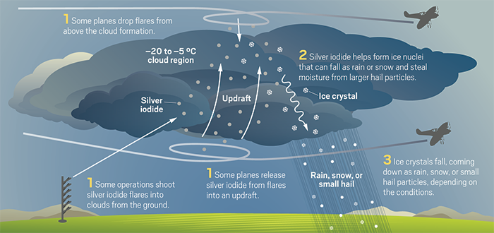 I nuclei che vengono usati in questa pratica sono artificiali: il più conosciuto è lo ioduro d’argento (in alternativa, si può usare il ghiaccio secco, ovvero anidride carbonica allo stato solido), un composto inorganico dalla struttura simile a quella del ghiaccio capace di legarsi alle molecole d’acqua presenti nella nube. In questo modo, si formano dei piccoli cristalli di ghiaccio che si uniscono tra loro e formano i fiocchi di neve i quali, attraversando il livello zero dell’atmosfera, si sciolgono e formano la pioggia.