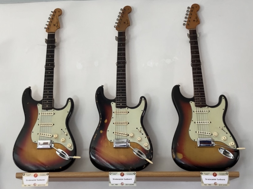 Sulla relazione con la sua ‘Black Strat’ del 1969, David Gilmour, storico chitarrista e cantante dei Pink Floyd, aveva detto: “Devo ringraziarla per tutta la musica che mi ha donato. Succede semplicemente che su quello strumento io riesco ad esprimere le mie emozioni nel modo più autentico possibile”. Un’altra connotazione di questi pezzi di artigianato è il loro colore: “L’originale colorazione Stratocaster è la Sunburnst, con le venature del legno che si vedono sotto una leggera mano di vernice nera che definisce grossolanamente i contorni e sfuma verso il centro del corpo in tabacco. Da quando, però, Jimi Hendrix a Woodstock nel 1968 si presentò con la celebre Olimpic White, i fan impazzirono per le Strato in bianco. Un altro esempio è la versione nera con il battipenna bianco che divenne celebre grazie ad Eric Clapton.”