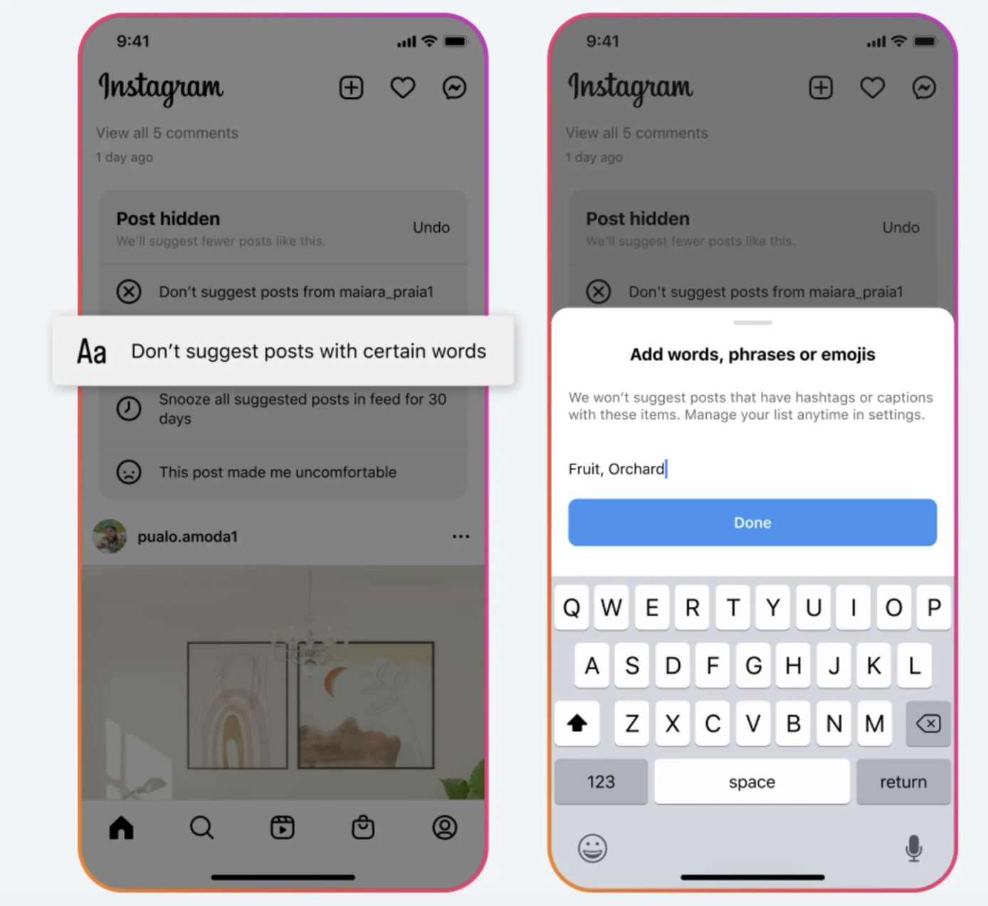 Novità in arrivo su Instagram. La piattaforma ha lanciato una serie di nuove funzionalità, il cui scopo è lasciare più libertà agli utenti nell’utilizzo del social. Le ultime modifiche, in particolare, consistono nel potere di controllare ciò che appare nel proprio feed, di silenziare le notifiche e di nascondere i post contenenti qualsiasi parola chiave scelta dagli utenti. Inoltre, la piattaforma sta adottando delle misure per consentire un ulteriore controllo sui feed che fornisca ai genitori maggiori informazioni sulle abitudini dei loro figli.