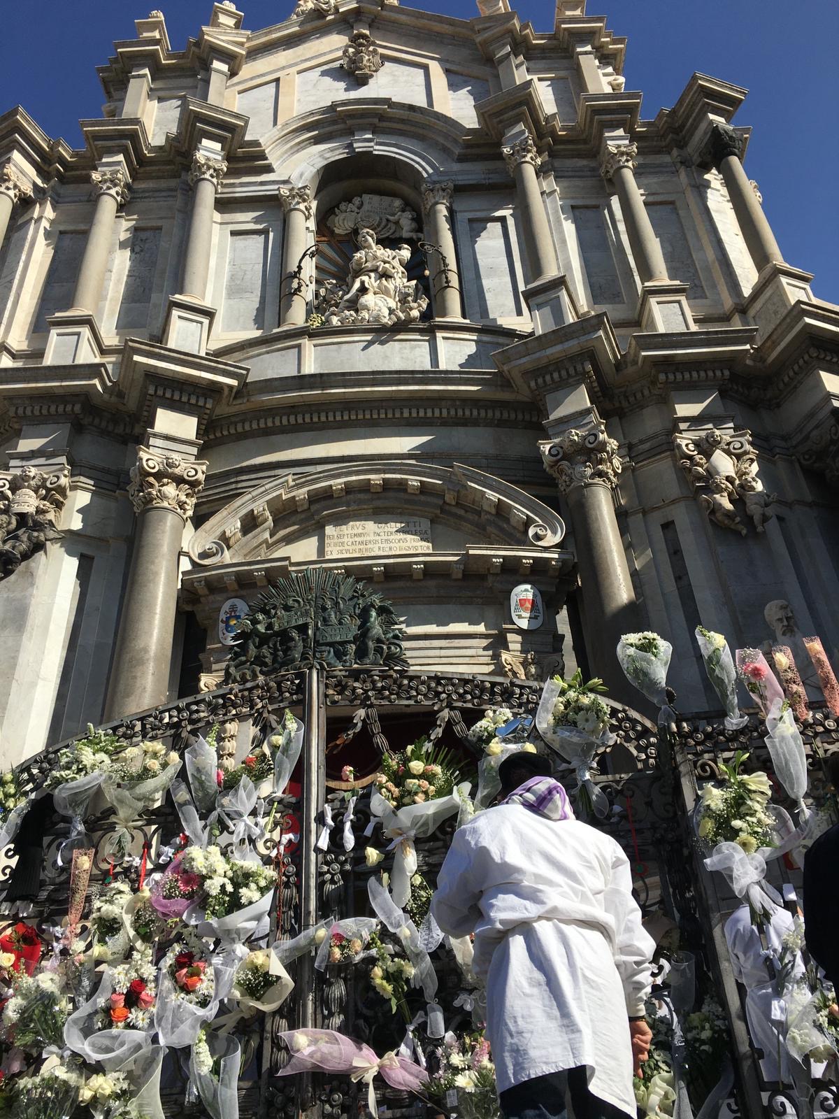 Questa devozione, come sottolinea la giornalista, «travalica i confini siciliani». Essa spinge molti catanesi fuorisede a tornare ai piedi dell’Etna per partecipare in prima persona ai festeggiamenti patronali. È il caso di Giuseppe Zampino, 38enne che dal 2014 risiede a Conegliano, in Veneto, dove lavora come ingegnere delle telecomunicazioni per un’importante azienda italiana. Anche quest’anno, Giuseppe torna in città per partecipare a tutti i momenti salienti della festa: dall’’Offerta della Cera’ del tre febbraio, alla ‘Messa dell’Aurora’ del quattro febbraio; dalla processione del “Giro Esterno” a quella del “Giro Interno”, i cui ultimi appuntamenti più sentiti sono la ripida salita di via di Sangiuliano – un tempo fatta di corsa, fino alla tragedia del 2004 – e il canto delle suore di clausura in via Crociferi, che in passato scandiva l’alba prima del rientro in Cattedrale. Eventi a cui Giuseppe partecipa indossando il tradizionale sacco – l’abito bianco che i fedeli indossano in segno di voto nei confronti della propria patrona – e con il quale lui prende parte al fiume di devoti che traina, senza mai lasciarli, i “cordoni” del fercolo. «La mia promessa è quella di essere quanto più buono e misericordioso verso il prossimo perché io dico sempre che ho avuto la fortuna di essere in salute e di vivere in una famiglia con dei sani principi, quindi cerco di aiutare le persone che vedo in difficoltà», racconta l’ingegnere, non senza un pizzico di commozione. Poi, prosegue: «Penso che Sant’Agata non chieda qualcosa in cambio ma vorrebbe che emulassimo il suo virtuoso esempio. Piuttosto che caricare un grosso cero o un grande mazzo di fiori, porterei una busta da dieci chili di spesa a chi, in questo periodo, non è in grado di arrivare alla fine del mese».