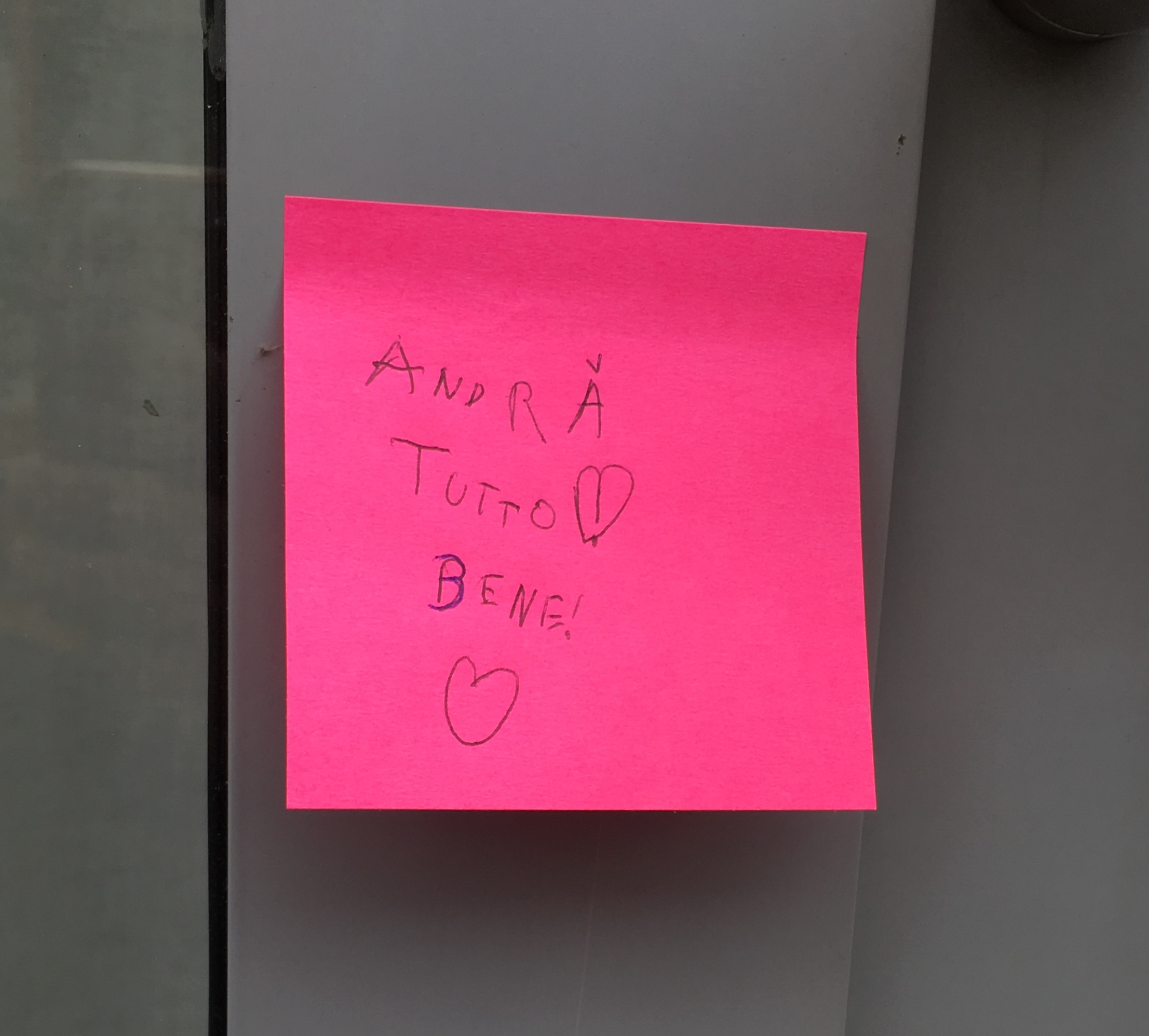 La scrittura incerta di un bambino, due cuori ed una frase di speranza: «Andrà tutto bene!».