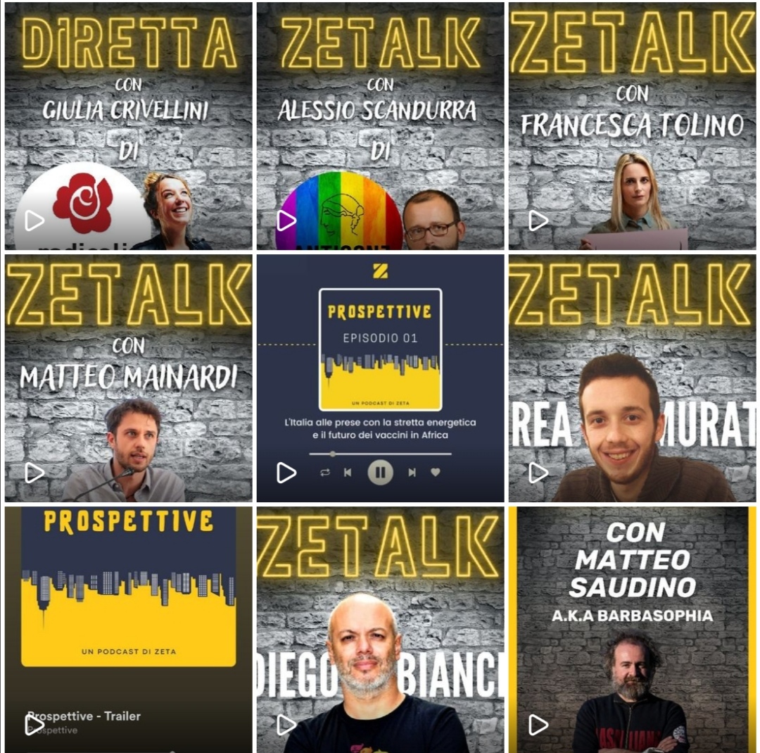 Non solo video, ma anche audio: la dimensione Zeta si è arricchita di ben tre podcast: Il Posto Fisso, Prospettive e ZeTalk. Il primo parla del mondo del lavoro dal punto di vista dei giovani, delle loro aspettative e aspirazioni e di temi come lo sfruttamento, la parità salariale, la condizione femminile e l’innovazione. Ogni episodio di Prospettive racconta in quindici minuti cosa aspettarsi dal mese che verrà, quali saranno gli argomenti di cui si sentirà parlare e quali scenari potrebbero verificarsi. ZeTalk racchiude tutte le dirette di Instagram realizzate con gli ospiti più vari, da Diego Bianchi di Propaganda Live allo storico Carlo Greppi, passando per il docente di Filosofia e Storia Matteo Saudino “BarbaSophia”.